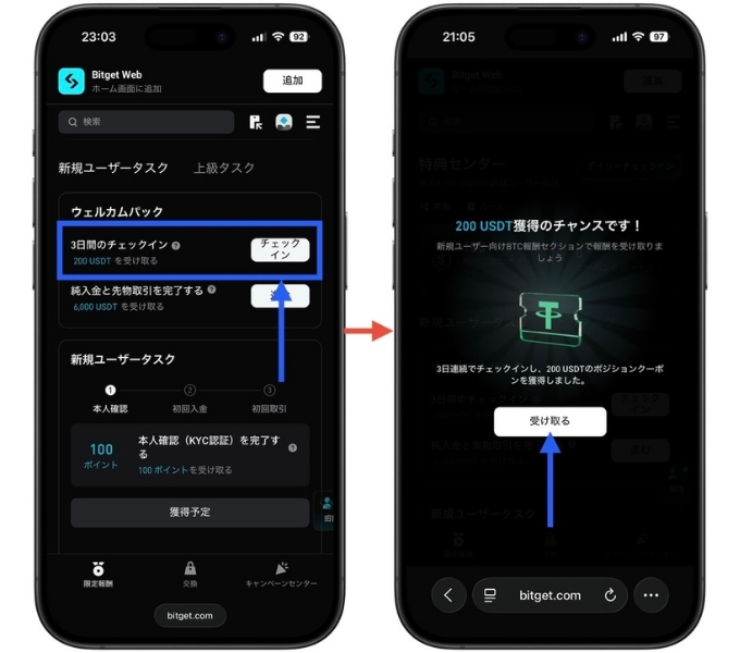 ②Bitgetに3日間チェックインで200USDTクーポン。